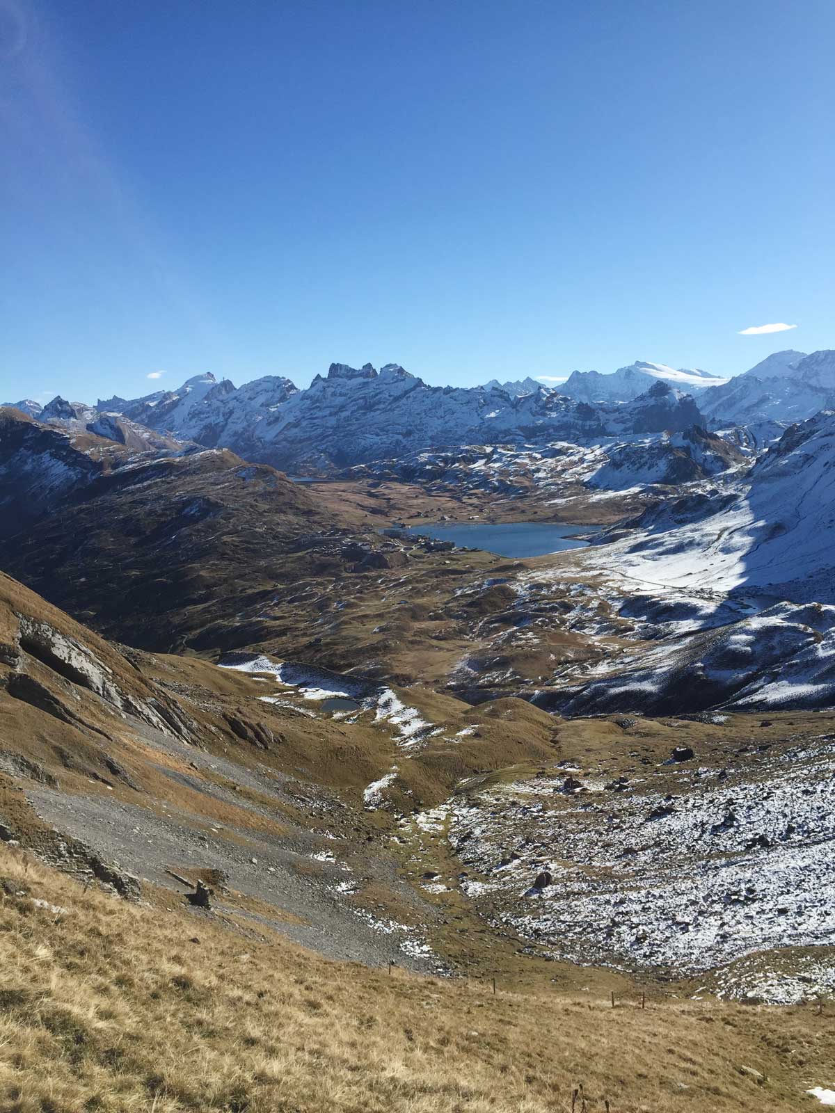 Für das Projekt «Ort 4» von Jo Achermann wurde ein markanter Ort auf dem Pass Abgschütz ausgewählt. Er befindet sich auf einer Talflanke mit wunderschönem Blick auf das Obwaldnerland mit seinen Seen und Bergen und ist nur zu Fuss erreichbar. Er verbindet die Aelggi-Alp, den geografischen Mittelpunkt der Schweiz, mit Melchsee-Frutt. An diesem Ort findet das Gesamtprojekt Orte» von Jo Achermann, für welches das Panorama in der Galerie Hofmatt Sarnen die Ideengeberin war, seinen vorläufigen Höhepunkt. Für die ersten landschaftlichen Bezugspunkte von «Orte» stehen bereits Skulpturen am Schiffssteg Seefeld am Sarnersee, auf dem Vorplatz der Kapelle St. Niklausen und vor der Kapelle Ramersberg. Um den Wiedererkennungswert mit den schon platzierten Skulpturen zu erhalten, wurden das Material (Eiche) und die Aussenmasse beibehalten. Die Aussen-Form prägt die Innen-Form und umgekehrt und zusammen die dazu gehörige Rhythmik der 25 Balkenteile.