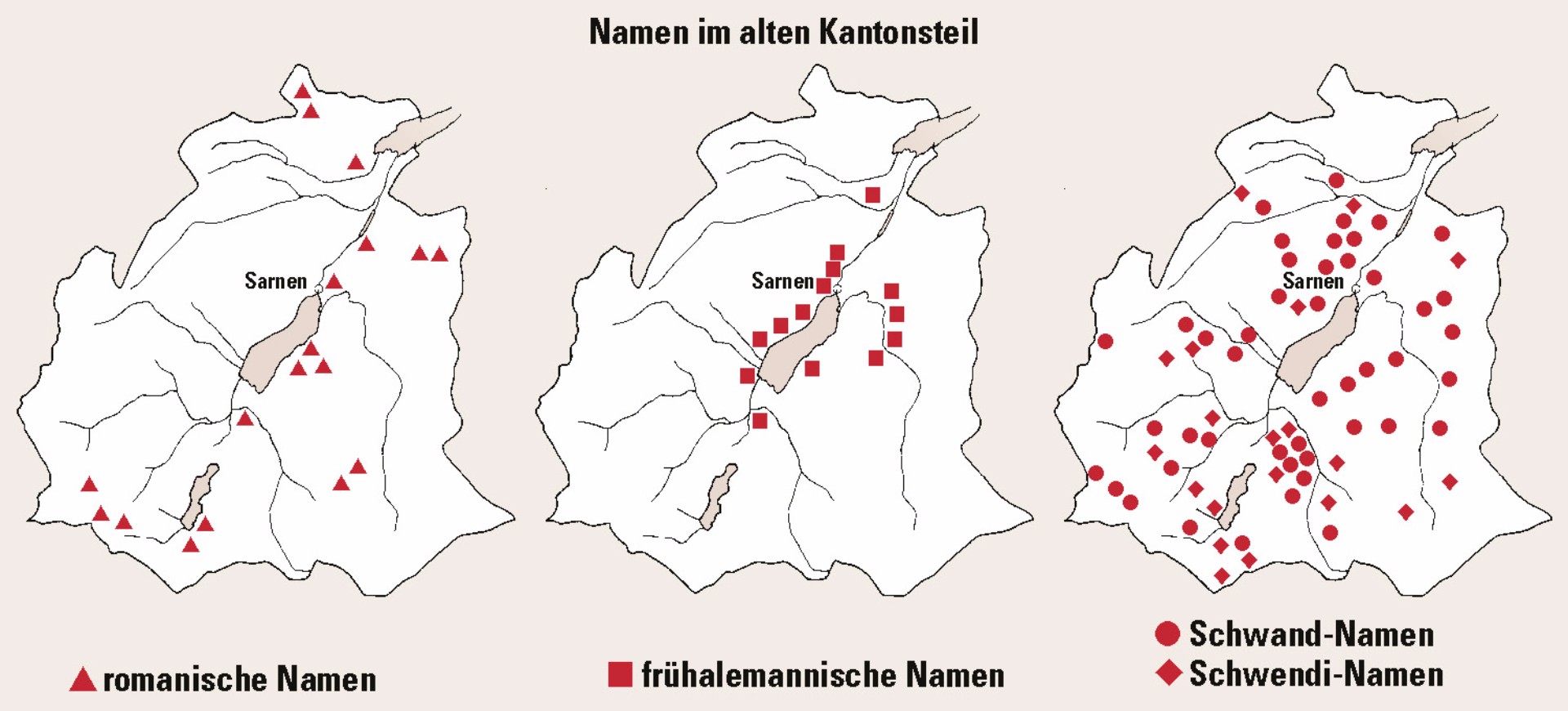 In diesem Beitrag soll die Obwaldner Kulturlandschaft im Spiegel der Namen und Namenschichten betrachtet werden. Neben den archäologischen Funden sind die schriftlich oder mündlich tradierten Orts- und Flurnamen die frühsten Quellen zur Siedlungs- und Kulturgeschichte. In Namen sind oft Spuren von früher gesprochenen Sprachen versteckt; um diese zu enträtseln, muss die Sprachwissenschaft zu Hilfe kommen. Keltisch redete der helvetische Stamm, der nach 400 v. Chr. das spätere Obwalden besiedelt hat - zu ihm stiessen um die Mitte des 1. Jahrhunderts v. Chr. die Römer, die das Lateinische (Provinzialrömische) als Amtssprache einführten. Nach dem Jahr 700 n. Chr. drangen allmählich die deutschsprechenden Alemannen nach Unterwalden ob dem Wald ein und vermischten sich mit der vorher anwesenden keltisch-römischen Bevölkerung.